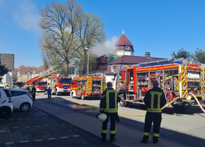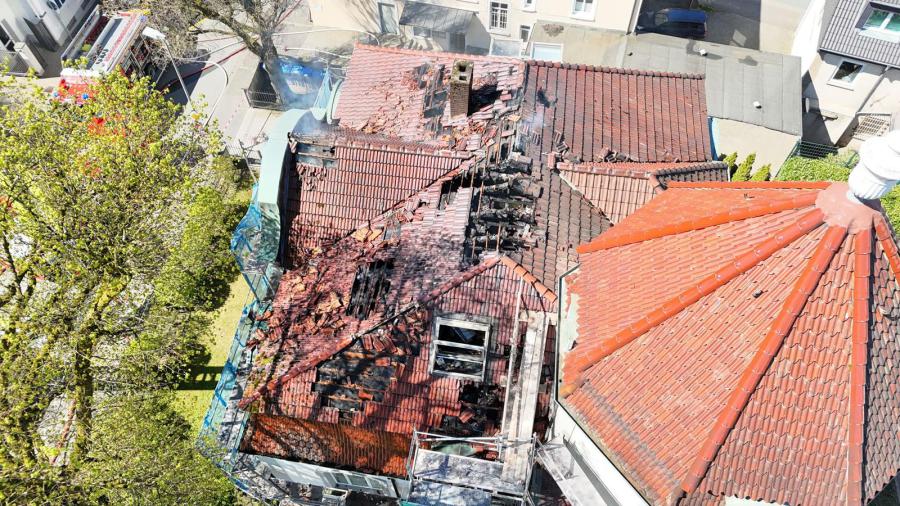 Heute, Mittwoch 22.04.26 um die Mittagszeit brach im Dachstuhl unserer schönen Villa, deren Fassade derzeit saniert wird, ein Schwelbrand aus. Die Feuerwehr bekam den Brand unter Einsatz von viel Wasser unter Kontrolle und musste dazu das Dach "aufbrechen", um die Brandstellen erreichen zu können. Personen wurden zu unserer großen Erleichterung nicht gefährdet. Die Kripo wird die Brandursache untersuchen, sobald das Gebäude betreten werden kann.